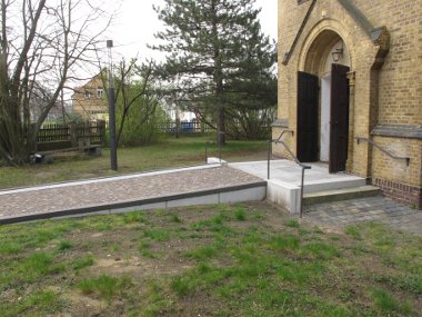 Rollifahrer aufgepaßt!Die Johanneskirche Wolfen hat seit 2023 einen barrierefreien Zugang (schiefe Ebene), offiziell: Zuwegung. So können auch Rollstuhl- und Rollatorfahrer den Eingang bequem erreichen, ohne auf fremde Hilfe angewiesen zu sein.Dazu ein: Plakat